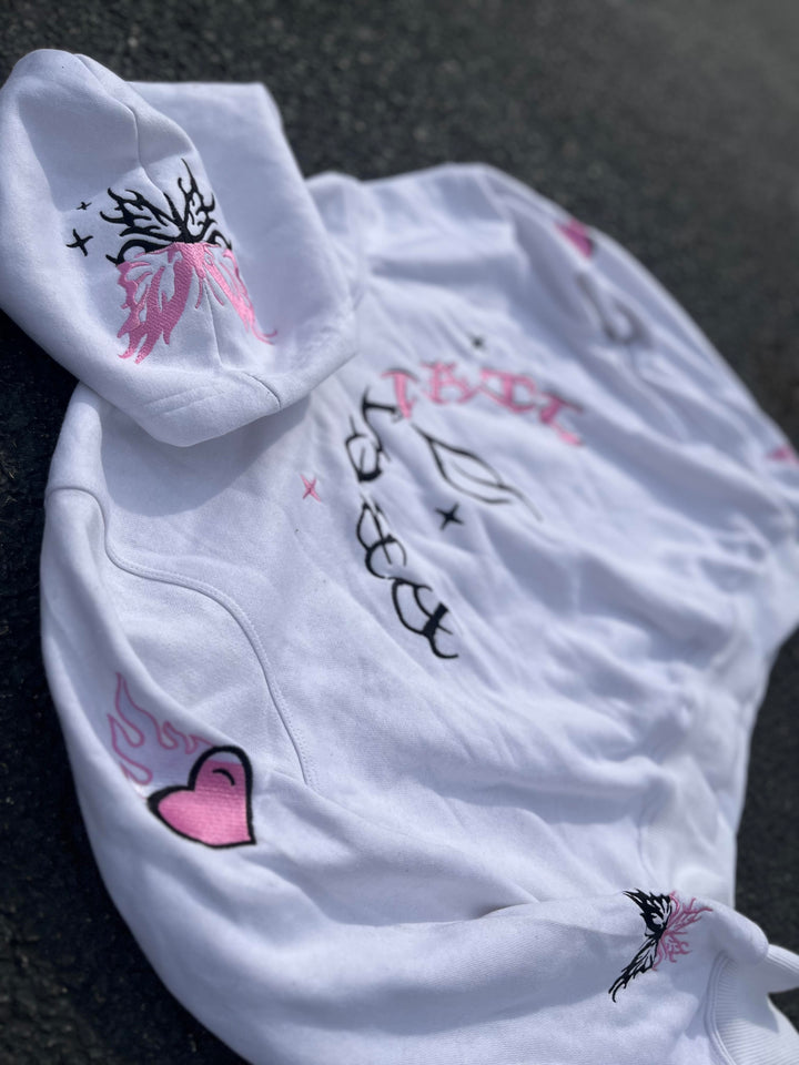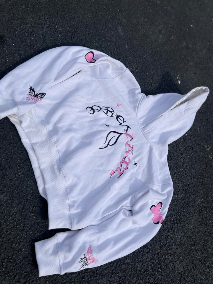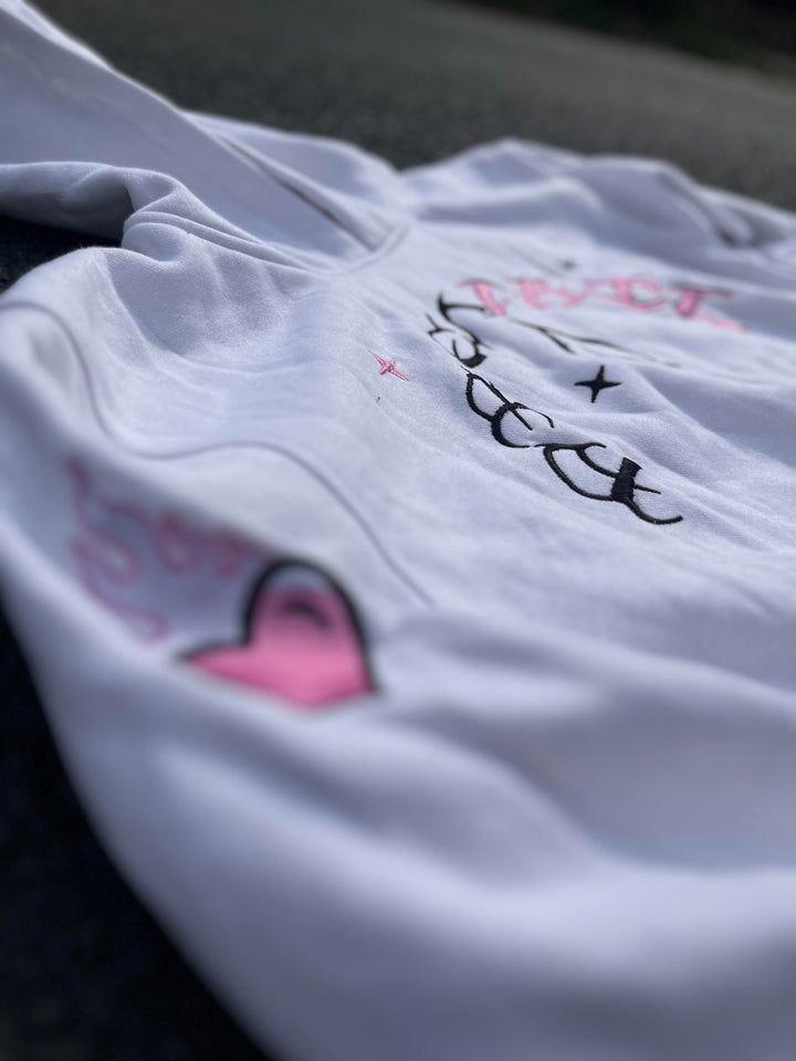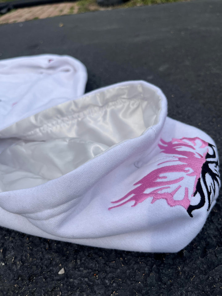 The Prevail satin-lined White hoodie is truly beautiful. The design features a silky satin-lined hoodie for the interior to prevent drying and frizzing of the hair. Materials used are 100% cotton with 350 GSM, giving customers a soft comfortable texture and warmth. The designs on this beautiful piece are embroidered and hand-sewed from front to back giving a more lively clean look.